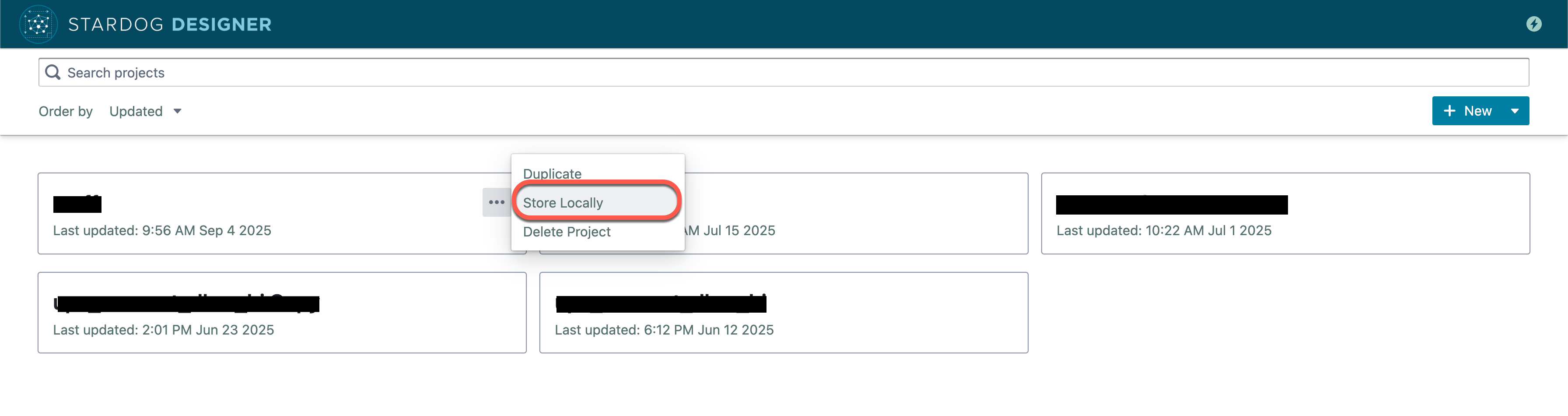 By default, Designer work is stored in your browser from session to session. If you use a different browser (or clear out your browser), you will not see your old projects. To avoid this, click the 3 dots for your Designer project (on the screen that shows all your projects) and click "Store locally".