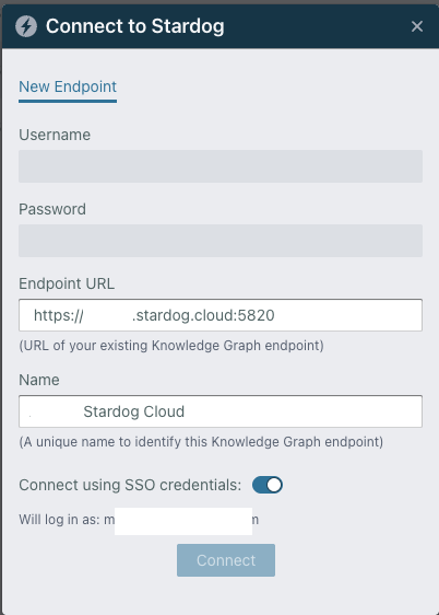 Finally, enter the Endpoint username and password (as created via Studio or CLI), the Endpoint URL (example below), and, if using Stardog Cloud or your own SSO integration, click the "Connect using SSO credentials" toggle (Stardog Cloud essentially serves as the SSO):